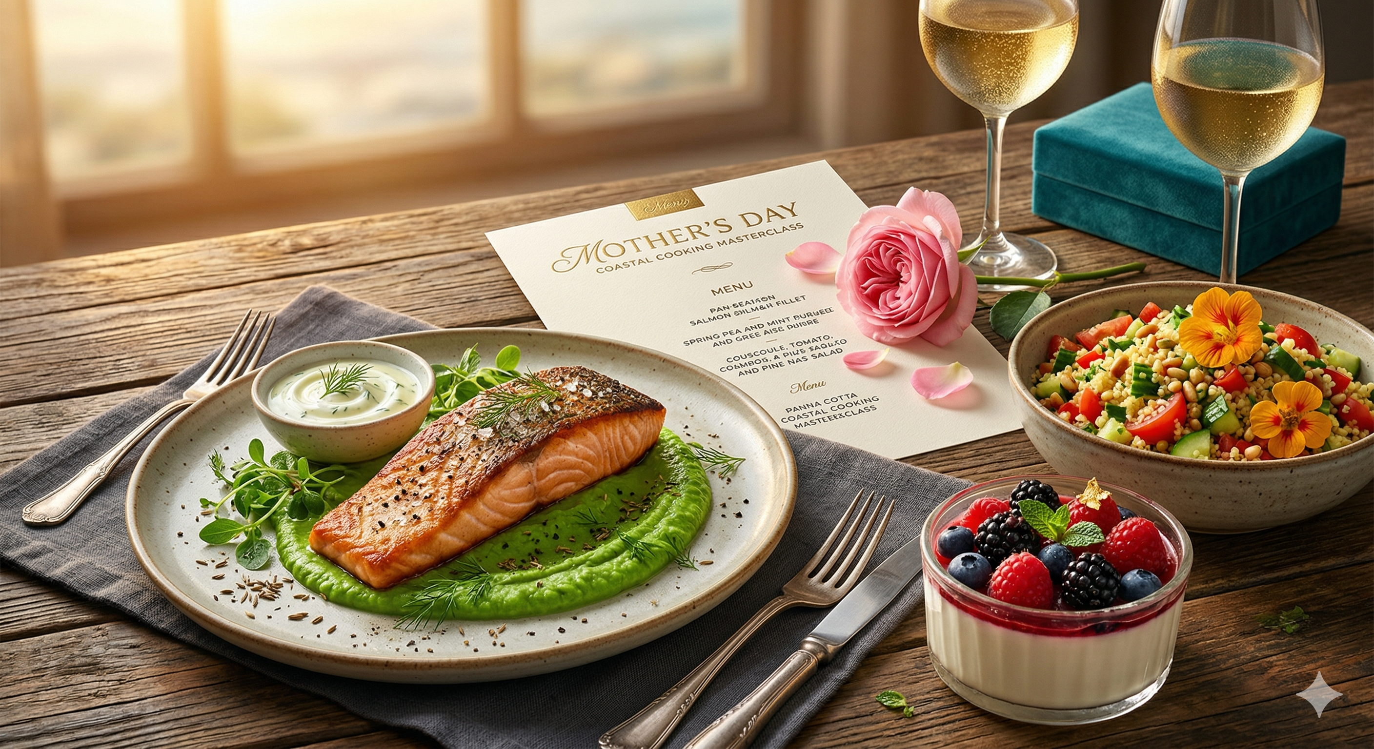 Our coastal cooking class is a celebration of fresh spring flavors and simple, refined techniques. We will focus on mastering the single most important skill for cooking fish: the perfect, crispy sear. It is a relaxed, supportive session designed to help you build confidence in the kitchen while creating a genuinely exquisite meal to share. It’s the perfect way to say "Thank You" with elegance, creativity, and connection.